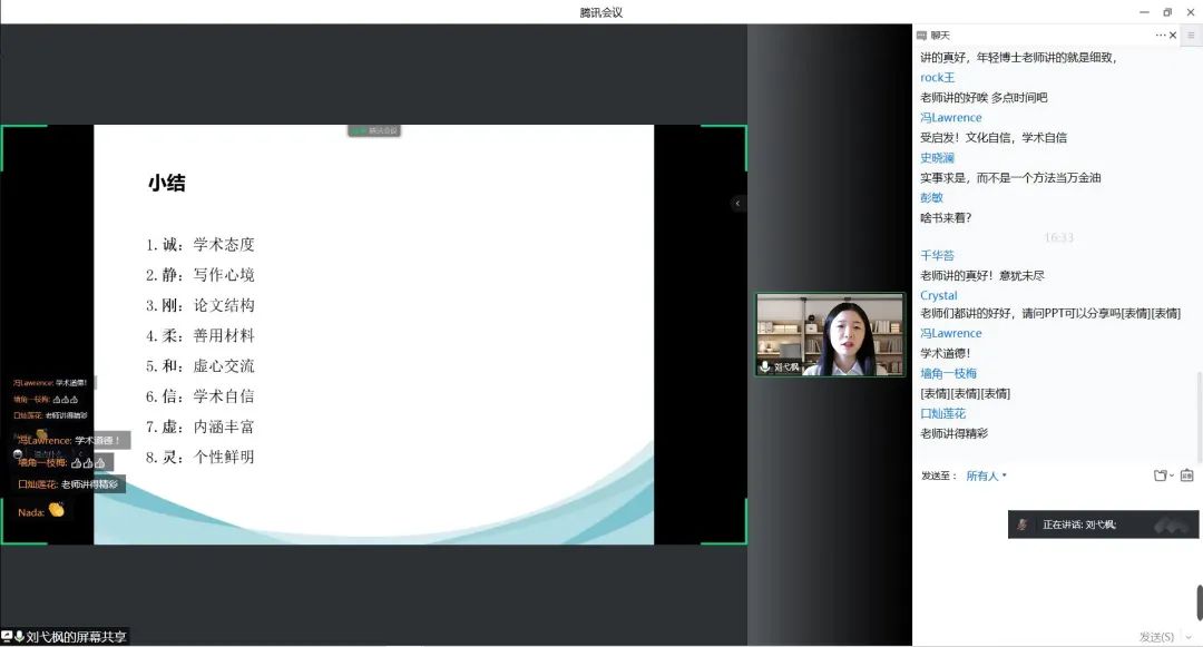 刘弋枫老师以“诚、静、刚、柔、和、信、虚、灵”八个字为小结,鼓励同学们要有学术自信、虚心学习。