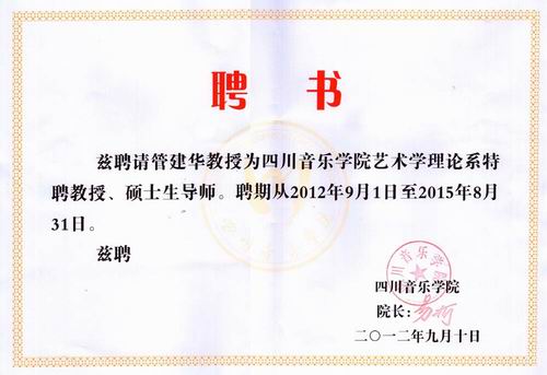 2012年9月底,我院隆重举行了“纪念王光祈先生诞辰120周年学术研讨会”。会议期间,经学院批准, 我系聘请了南京艺术学院音乐研究所所长、中国世界民族音乐学会副会长、教育部艺术专业指导委员会委员、博士生导师管建华为特聘教授、硕士生导师,并向管教授颁发了聘书。