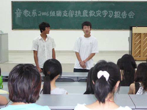 2008年6月6日下午,音乐教育系2006级学生在系党总支的关心与支持下,由团总支副书记王蜀南老师在阶梯教室主持召开了 “音乐教育系抗震救灾学习报告会”主题团会。会上,抗震救灾志愿者支振旭、李朋霞、贾微波、钱鑫、尹诗凯等同学讲述了在一线当志愿者期间的见闻和感受,用当时拍下的照片讲解了一些令人感动的真人真事,以直观的方式让同学们真实感受到了受灾地区的状况。同学们反响热烈,热泪盈眶,不断地讨论和举手提问,并表示了自己欲做志愿者的决心,准备用自己的方式表达自己对受灾群众的关心。 这次活动让同学们深受感动,增强了大家对生命的热爱之情。同时,我们欣喜地看到新一代大学生强烈的民族意识以及在灾难来临时团结一心的优良品质,显示出了“80后”人的勇敢无畏、坚强不屈的精神面貌。