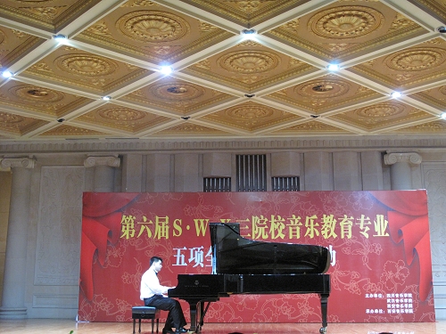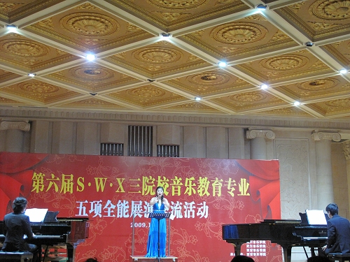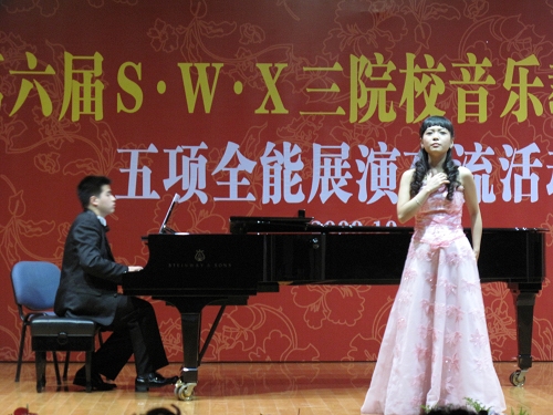 2009年10月26日—30日,第六届四川、武汉、西安三音乐学院(swx)音乐教育专业五项全能展演交流活动在西安音乐学院隆重举行。本次活动内容丰富,除五项全能展演外,还有中国教育学会音乐教育分会主持的全国教育科学规划教育部重点课题“音乐教师培养国际比较研究”子课题——“全国专业音乐院校音乐教师教育研究”结题会、全国专业音乐院校音乐教育系系主任论坛以及全国专业音乐院校音乐教育系教研室主任工作交流会等活动。 我系在学院的关心支持下,组成了近二十名师生的参会队,参加了本次各项交流活动,并于27日晚在西安音乐学院学术厅举行了展演音乐会。四名选手分别就声乐演唱、钢琴演奏、自弹自唱、合唱指挥、舞蹈五个项目进行了精彩的展演,博得了各位专家的一致好评,现场观众的掌声经久不息。 比赛结束,我系四名选手分别获得全能第一和各个单项第一的好成绩。西安音乐学院党委书记安宁教授登上舞台,向我系师生表示祝贺,并合影留念。