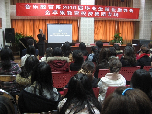 2009年11月19日,金苹果教育投资集团来我系举办了2010届毕业生就业指导交流会。通过此次交流会,使我系毕业生充分了解了目前的就业形势和中小学校的选人标准,同时也对金苹果教育投资集团旗下的金苹果公学和龙江路小学(南区)有了更多的认识。会后同学们纷纷感到,要想进入优秀的中小学工作,必备的能力和素质是多方面的,如合唱指挥、管乐队的组织排练、舞蹈编排等都是非常重要的教育教学技能,同时普通话、粉笔字、课堂教学等教师基本功也一样不能落下。 在今后的就业指导工作中,我系还将继续为同学们提供这样的面试交流机会,为我系的毕业生创造更好的就业机会。