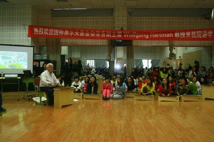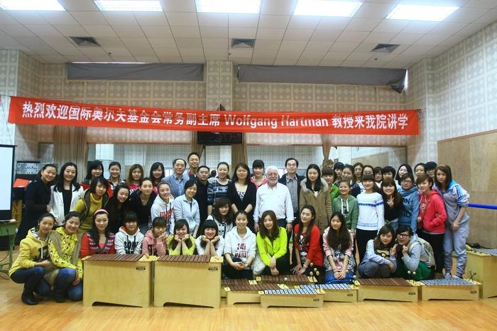 2012年3月26日至27日,应今年会jinnian官网音乐教育研究中心的邀请,德国奥尔夫基金会副主席、奥地利克拉根福音乐学院音乐教育系主任沃尔夫冈•哈特曼(Wolfgang Hartman)教授莅临我院,为音乐教育专业师生讲授了为期两天的奥尔夫教学观摩课。沃尔夫冈•哈特曼教授曾在奥地利萨尔茨堡的奥尔夫学院直接师从奥尔夫先生本人,被认为是当今国际上优秀的奥尔夫音乐教育专家之一。 在为期两天的奥尔夫教学观摩课中,哈特曼教授所讲授的课程的内容包括:演唱教学、节奏教学、奥尔夫乐器教学及创设情景教学等。哈特曼教授在授课过程中,强调音乐的学习不能让孩子们只是把注意力集中到如何演奏乐器或歌唱训练上,而是应该首先让广大儿童通过课堂游戏和各种来自于生活的活动喜爱上音乐,以至于能逐渐发展为自己制作音乐、创编音乐和享受音乐。哈特曼教授丰富的教学经验、生动翔实的授课内容、严谨务实的态度和幽默诙谐的风格给所有在场的老师和同学留下了深刻的印象,师生们对两天的观摩课反响十分强烈,纷纷表示要尽快尝试将哈特曼教授的教学观念和方法应有于自己的学习和工作之中。