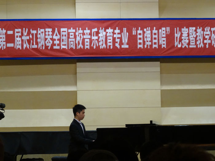 在“自弹自唱”课程教学研讨会上,各院校代表都纷纷发言,对于选手们的精彩表现及发挥,都表示感到惊讶和欣慰,并就选手们此次比赛中演唱、演奏和即兴伴奏部分展开了细致的讨论。我院院长安冰冰教授首先肯定了参赛选手们的水平,赞赏他们自弹自唱尤其是抽签曲目完成质量高、基本功到位。随后,他分别从钢琴的控制(如音色、力度)、伴奏与独奏的区别、踏板的使用、抽签作品的读谱(如基本节奏、音乐表现、织体的训练)等几个方面做了详尽又精彩的点评。