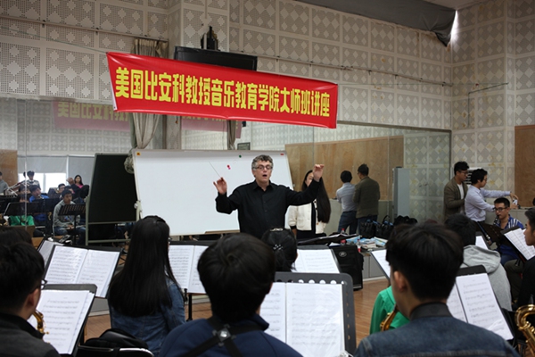 2014年10月18日,19日,美国西华盛顿大学音乐系主任Christopher Bianco来到川音音乐教育学院给管乐教育专业进行了为期两天的大师班排练及专题讲座。 Christopher Bianco毕业于美国西北大学音乐教育专业,德克萨斯州乐队指挥博士学位,现在是西华盛顿大学音乐系主任,同时任音乐团总监。在两天的排练与讲座中,Christopher Bianco用其幽默的语言,丰富的经验与方法提高了音乐教育学院管乐教育专业的管乐演奏水平。同时,他还给在座的每位师生细心讲解了在乐队指挥和管理中会出现的问题,以及解决办法,使得师生的教学能力与水平得到提升。