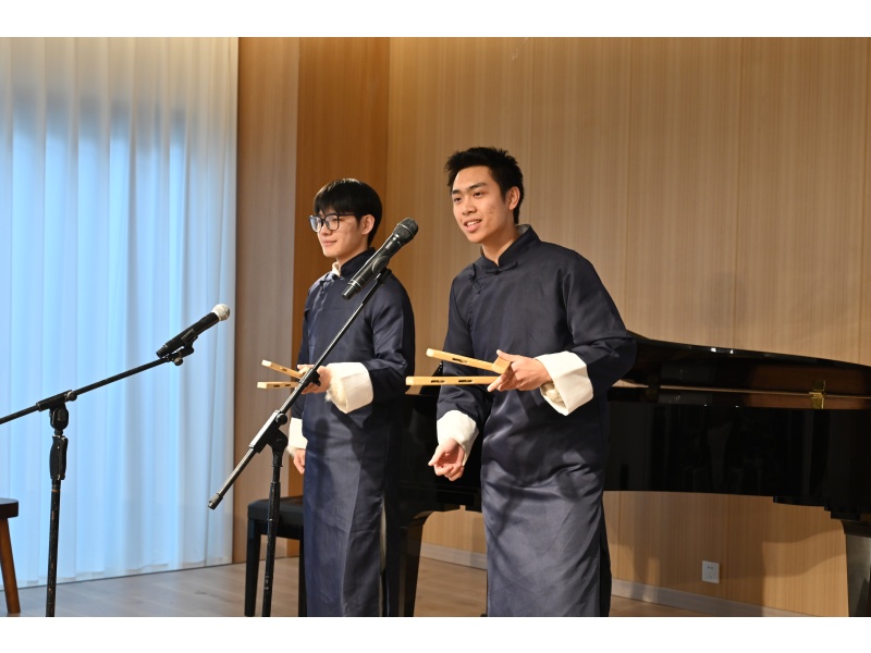 颁奖活动中,我院青年教师韩悦呈现精彩音乐党课《我爱你中国》、研究生杨惋淇呈现音乐党课《年轻的朋友来相会》,将我们带回了那个激情澎湃的岁月。随后,本科生何家昱和袁恒烯表演了四川非遗文化金钱板《四川茶馆》,凸显新一代年人对传统文化的热爱和传承。