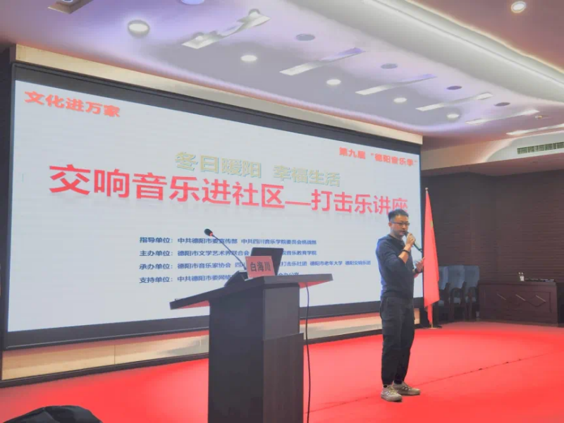 讲座由德阳市音协主席冯忠良主持,他说,本次讲座重在提高我市音乐人才的专业素质,构建优秀的音乐骨干队伍,营造健康、高雅的音乐艺术文化氛围,让大家更好地了解打击乐音乐文化,丰富群众精神文化需求。今后,希望在白教授参与指导下,德阳打击乐艺术向专业化方向发展,为德阳发展擂鼓助阵,共绘美丽德阳新篇章。