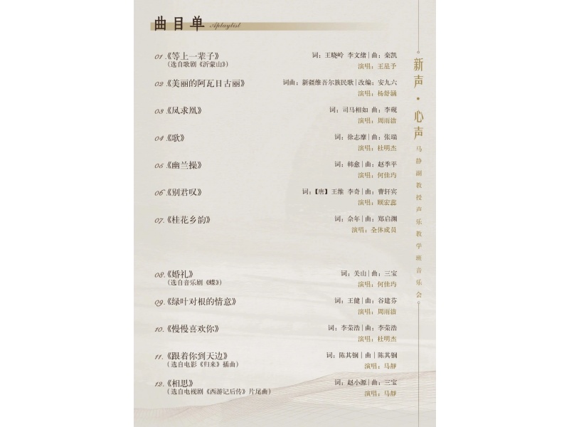 马静副教授声乐教学班将于11月21日19:30在小音乐厅举办《新声·心声》音乐会。本次音乐会不仅展现声乐教学成果,更是以艺术形式践行高校服务社会的使命。