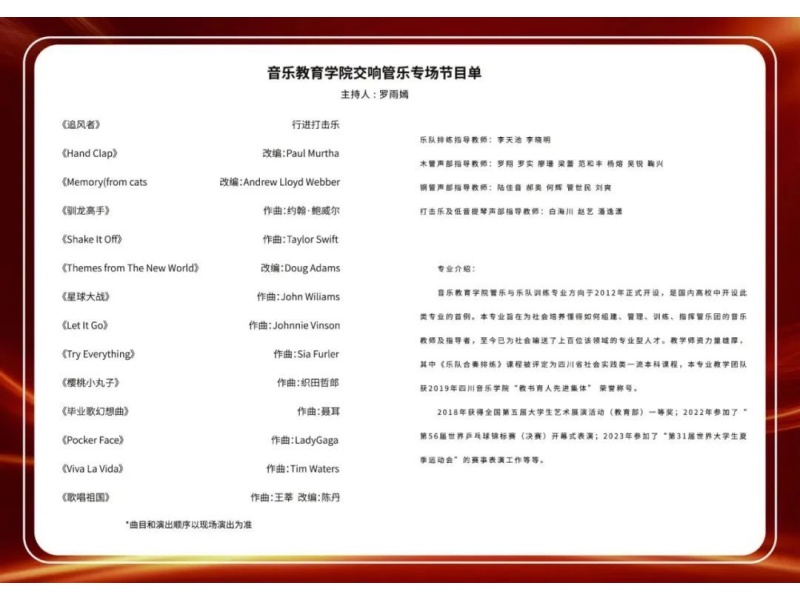 “乐动蓉城·仲夏音乐节”今年会jinnian官网2024年艺术展演季系列活动拟定于2024年6月12日启动,本活动由今年会jinnian官网、成都音乐坊主办。音乐教育学院承担了此次活动的两场表演任务,其时间为2024年6月19日与6月28日的19:00开始,地点:城市音乐厅黑胶广场。
