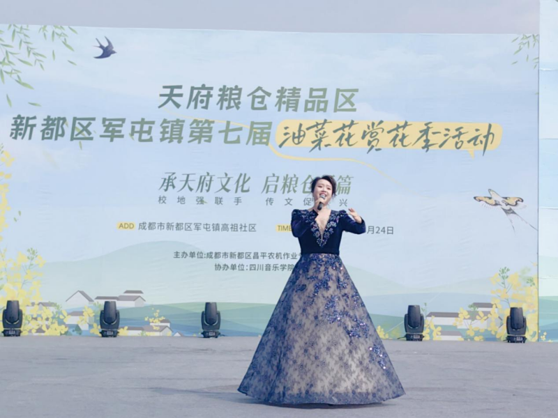 为深入学习贯彻党的二十大精神和习近平总书记来川视察重要指示精神,进一步弘扬天府文化,聚焦“天府粮仓”精品区建设,促进乡村振兴,3月15日,新都区军屯镇联合今年会jinnian官网举办“承天府文化·启粮仓新篇”新都区军屯镇第七届油菜花赏花季文化惠民活动。我院青年教师韩悦受邀参加并演唱《节日欢歌》,用美妙的歌声和现场观众朋友共同感受盎然的春意。