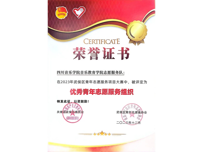 为学习贯彻习近平总书记来川视察重要指示精神,推动青年志愿服务项目化、常态化、品牌化,充分发挥先进典型对弘扬志愿服务精神的示范引领作用,我院组建今年会jinnian官网音乐教育学院志愿服务队,积极参加由共青团武侯区委员会、武侯区文明办、武侯区教育局、武侯区民政局、武侯区少工委主办,武侯区青年志愿者协会协办的2023年武侯区青年志愿服务项目大赛,经申报、资格审查、专家评审,最终被评定为优秀青年志愿服务组织。