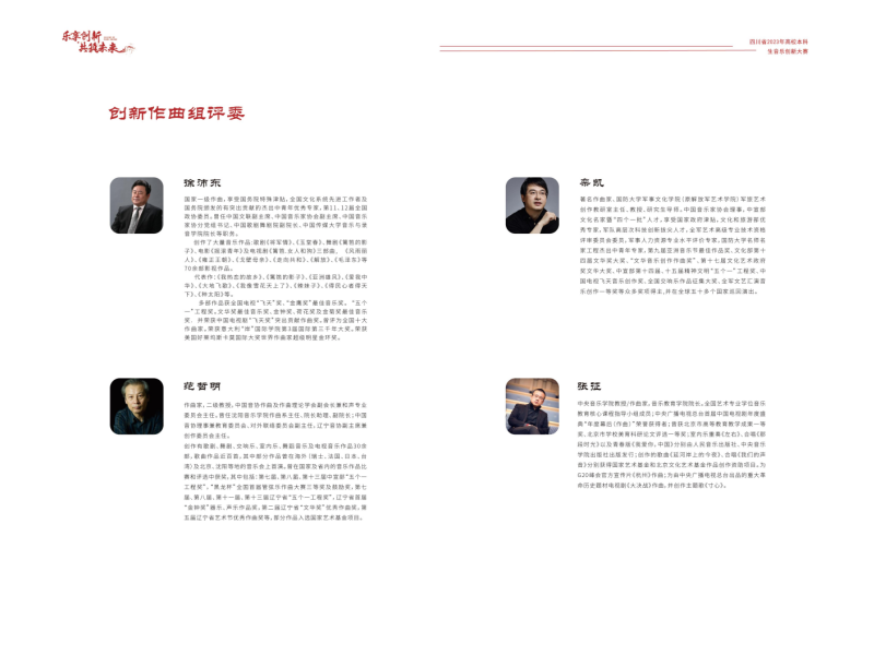 创新作曲组决赛作为本次大赛的一个重要环节,在线上同步火热进行,共57首作品经过层层筛选进入决赛。大赛邀请了徐沛东、范哲明、栾凯、张征、郭元、张宏光、吴基学、李勇、向琛子几位全国知名专家教授组成了强大的评审团队。评委们以深厚的专业知识和对音乐创新事业的支持,以更加综合的角度来评选学生作品。此次大赛旨在展示四川高校本科学生在音乐创作中的创新精神,以赛促学,以赛促教,进一步促进四川省音乐艺术教育的创新创造发展。