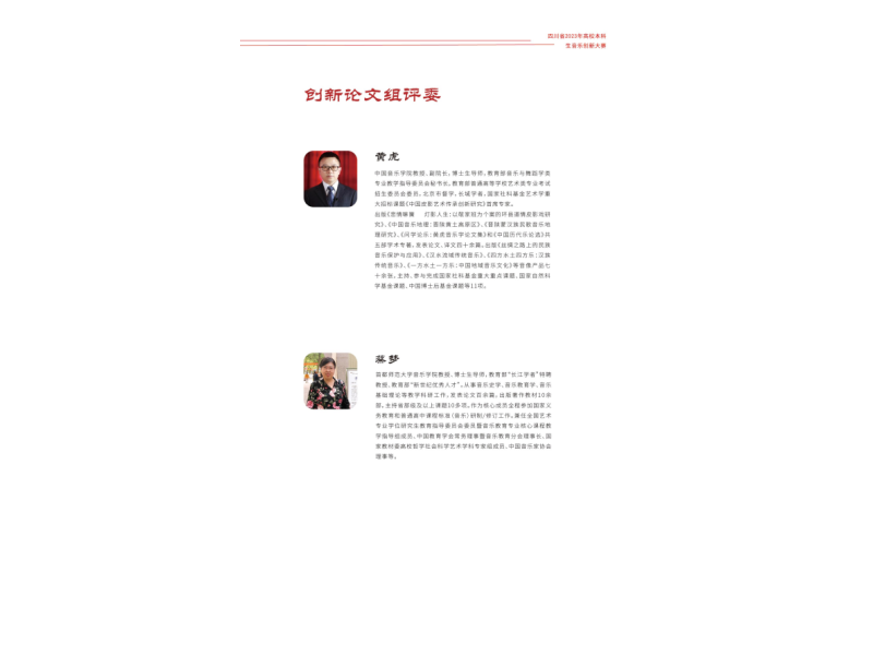 经过激烈的角逐,创新论文组108篇优秀论文进入本次决赛,在线上同步竞选。为提高比赛的整体质量和水平,有力促进音乐理论创新研究的进步,大赛论文组邀请了黄虎、蔡梦、肖学俊、靳学东、尹爱青、徐元勇、雍敦全几位全国知名的专家教授作为创新论文组的评审专家团队,增强赛事权威性,做到真正的公平公正公开,推动音乐教育创新发展。
