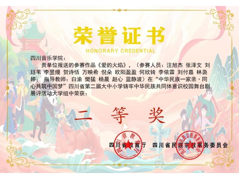 接到通知以来,我院高度重视,精心组织师生踊跃参与,推选了小音乐剧《爱的火焰》参与四川省第二届大中小学铸牢中华民族共同体意识校园舞台剧展评,荣获“二等奖”及“最佳表演奖”。该剧以大学生顶岗支教为背景创作,鼓励音乐教育师生更多投身支教事业,让支教工作走向社会,影响和号召更多的人加入支教的队伍,将这爱的火焰继续燃烧,助力教育振兴,为山区的留守儿童照亮前进的路,通向光明的未来。