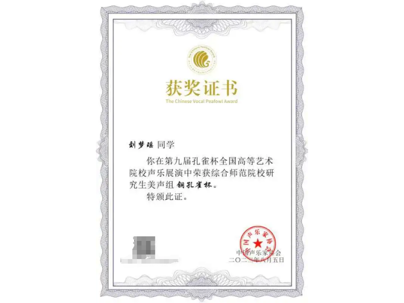 在第九届孔雀杯全国高等艺术院校声乐展演中,汪旭杰同学荣获综合师范院校本科生民族组银孔雀杯,刘梦瑶同学荣获综合师范院校研究生美声组铜孔雀杯,孔繁雨同学荣获研究生综合师范院校民族组优秀奖。热烈祝贺以上同学代表我院参加比赛荣获优异成绩!同时,也向他们的声乐指导老师:蓝静波、胡松、郭敏老师表示祝贺!