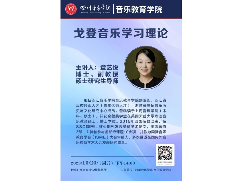 章艺悦,博士,副教授,硕士研究生导师,现任浙江音乐学院音乐教育学院副院长,浙江省高校领军人才(青年优秀人才),浙音长三角音乐历史与文化研究中心成员。曾就读于上海音乐学院(本科、硕士),并获全额奖学金在美国天普大学攻读音乐教育硕士、博士学位。2015年回国任教以来,在SSCI期刊、核心期刊发表多篇学术论文,出版著作3部,主持和参与省部级课题10余项,并作为国际音乐教育学会(ISME)大会审稿人,多次受邀在国内外音乐教育学术大会发表研究成果。