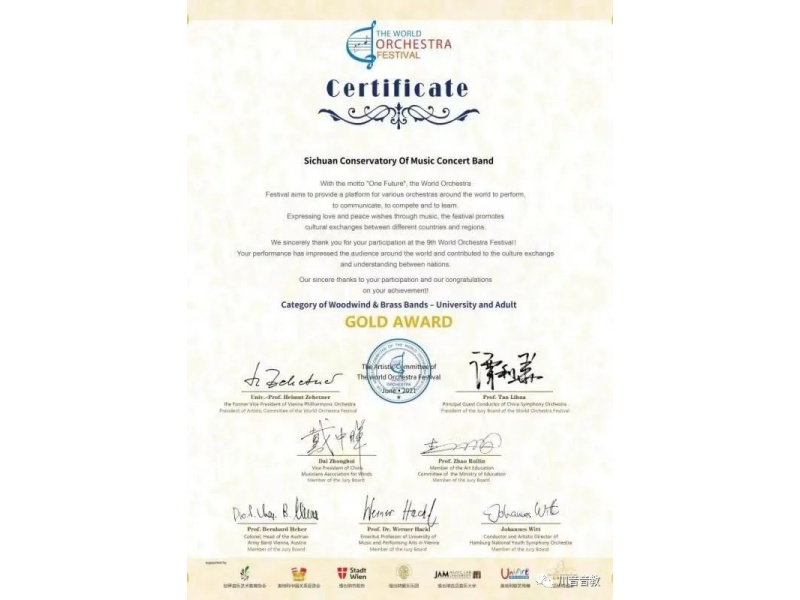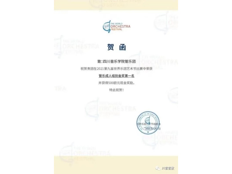 参与比赛的各组别各年龄段的金奖第一名团队都将获得500欧元现金大奖,向川音管乐团参加此次艺术团的专家、教师和同学们表示热烈祝贺!