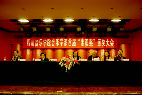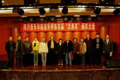 接下来,在台上就坐的领导、老师先后发言。首先,易院长代表学校领导,高度赞扬和缅怀了李忠勇教授生前“一身正气,两袖清风”,爱岗敬业、爱校如家、埋头苦干的崇高品格和工作作风。在介绍了“忠勇奖”与音乐学系的特殊渊源后,易院长不仅列举了李忠勇教授生前在创作、教学、管理等方面的诸多感人事迹,同时对在音乐学系设立“忠勇奖”这份首开先河的荣誉寄予了殷切期望。其次,“忠勇奖励基金会”名誉会长、李忠勇院长遗孀何福琼老师,在衷心感谢学院领导的理解与支持和音乐学系的大力协作的同时,特意向大家说明了“忠勇奖”的设立是遵从李忠勇生前在电脑中的留言:“一个平凡的人,来去平平凡凡为好。丧事从俭,不收花圈、礼金。”“为尊重他的遗愿,我和犬子李山、李星于去年岁末商定,将亲友所赠之丧亡慰问金(71380元)和学院发放的抚恤金(28620元)共计拾万元,转化为这个奖励基金。区区十万元虽微不足道,但都寄托了我们无尽的哀思。奖励基金之所以设在音乐学系,是因为李忠勇同志在担任院长工作期间鼎力谋划、筹备并获得党委的认同和高教局的批准而于1994年成立了音乐学系。其意在办好音乐学院的龙头专业。”何福琼老师这样说道。会上,音乐学系首任系主任颜曼秋老师以《忠勇坦诚,大爱无垠》的发言,表达她对忠勇师长特殊的缅怀与敬意。音乐学系老教师匡天齐教授则以李院长同班同学的身份,介绍了李忠勇教授早年读书、工作的感人事迹,以及他热心助人的高尚品格。另外,教务处副处长文锋教授以李忠勇教授学生身份做了题为《怀念恩师李忠勇先生》的发言。他说:“我认识李老师已有20年时间,我跟随李老师进修学习一共有5年时间,我自认为,我是接受李老师关怀和教诲最多的人。李老师是我心目中最伟大的老师,最慈爱的长辈,最亲切的朋友。”他是一个品德高尚的人,一个心胸开阔的人,一个博学多闻的人,一个治学严谨的人,一个诲人不倦的人。