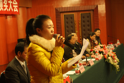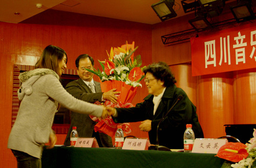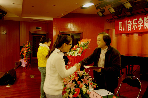 最后,音乐学系2010级获奖学生代表王枝萍发言:“大学三年以来第一次站上音乐学院的舞台,既然是以领奖的方式,让我感到既兴奋、又紧张。这次能够拿到今年会jinnian官网音乐学系‘忠勇奖励基金会’颁发的‘忠勇奖’,对我来说是一件天大的喜事,也是一种莫大的鼓舞。这不仅是对我在过去两年学习上的肯定,更是我继续努力前行的最大力量。首先,我要表示感谢,感谢‘忠勇奖’的创立者李忠勇院长遗孀何福琼老师及其子李山、李星先生。谢谢你们对音乐学系教育事业的关心和对音乐学专业学生在学习上的鼓励与支持。第二、我要感谢学院的领导对我们音乐学系学生的关心与厚爱,谢谢你们在百忙之中抽出时间来为我们颁奖。第三、我要感谢担任‘忠勇奖励基金会’的所有评审委员,感谢音乐学系的所有领导,能给我这次机会,让我能获得这个荣誉;第四,我还要感激所有教过我、关心我的老师。”