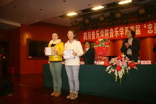 李忠勇教授于2011年逝世。他一生为音乐创作和音乐教育事业呕心沥血,先后创作有交响音画《云岭写生》,管弦乐曲《火把节之夜》等多部在国内外有影响力的作品。1989年,他被授予全国优秀教师,1993年获得国务院颁发的政府津贴。为了继承和弘扬李忠勇教授一生“忠于事业,勇于进取”,以及他尊师重教的精神,促进音乐教育事业的发展,本着公正、公平的原则严格审核,最终评选出了本年度首届“忠勇奖”获得者——音乐学系2010级音乐学理论专业学生王枝萍、2011级音乐治疗专业学生钱灵馨。随即,易柯院长与何福琼会长为获奖学生王枝萍、钱灵馨颁发荣誉证书和奖金。