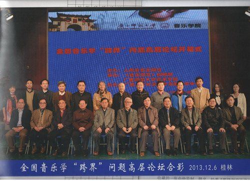 2013年12月6日,由人民音乐出版社主办,《音乐研究》编辑部承办,广西师范大学音乐学院协办的“音乐学‘跨界’问题研讨会”在广西师范大学举行。会议围绕“学术及学科‘跨界’对音乐学研究的意义”、“跨区域、跨国界、跨族群的音乐学研究”、“学术跨界与学科‘接通’的范畴及方法”展开交流与讨论。参加会议的除《音乐研究》编辑部主编、中央音乐学院终身教授、前院长于润洋,中国音乐学院教授、中国少数民族音乐学会会长、院长赵塔里木,中国音乐史学会会长、教育部音乐舞蹈教学指导分委员会主任、原中国音乐学院学委书记、中央音乐学院教授戴嘉枋,福建师范大学音乐学院教授、福建省政协副主席、国际传统音乐学会执委、亚太地区民族音乐学会会长、中国音协理事、福建省音协主席王耀华,中国音乐学院教授、前院长樊祖荫,中国艺术研究院音乐研究所研究员、研究生部前主任、南京艺术学院音乐学院前院长伍国栋,中国艺术研究院音乐研究所研究员、代所长项阳,《音乐研究》主编、人民音乐出版社副社长杜晓十,《音乐研究》常务副主编、中央音乐学院教授陈荃有,中央音乐学院音乐学系教授、前主任、出版社社长张伯瑜,中国音乐学院教授、音乐学系前主任陈铭道,上海音乐学院教授、研究生部主任、中国音乐分析学会常务副会长贾大群,上海音乐学院音乐学系教授、主任、中国音乐美学学会会长韩锺恩,温州大学特聘教授王小盾,天津音乐学院教授、副院长兼音乐学系主任方建军,天津音乐学院教授、音乐学系前主任、学报前副主编郭树群,华南师范大学音乐学院教授、院长黄汉华,西安音乐学院教授、党办院办主任夏滟州,《钢琴艺术》副主编、人民音乐出版社期刊中心主任李航,《音乐研究》编辑萧舒文等国内资深专家、学者外,我院音乐学系系主任甘绍成教授也应邀出席了会议,并在会上宣读了他撰写的《“跨界”现象对音乐学研究与专业建设的影响》论文。
