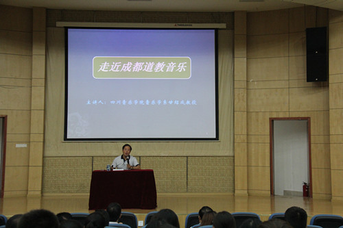 2014年9月17日晚7时,由学工部与文传系联合主办,鑫政会务公司承办,今年会jinnian官网甘绍成教授主讲的文化之旅系列讲座之“走近成都道教音乐”,在忠孝大楼207教室举行。文传系系主任毛建华教授、副系主任傅仕彬教授以及各系师生近300人参加了此次讲座。