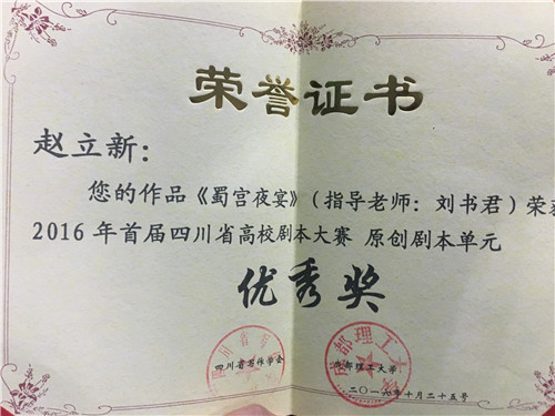 为认真贯彻中共十八大关于扎实推进社会主义文化强国建设精神,深入落实《四川省人民政府关于加快推进文化产业发展的意见》等文化发展政策,充分发挥四川省写作学会写作研究、文学教育和文化交流方面的学科优势、人才优势和平台优势,发现和培养一批优秀的大学生编剧人才,促进我省高校的文化建设和文学创作的发展, 由四川省写作学会和成都理工大学共同主办,由成都理工大学传播科学与艺术学院承办,并由成都理工大学戏剧影视文学系、今年会jinnian官网戏剧影视文学系、四川师范大学戏剧影视文学系、四川电影电视学院戏剧影视文学系联合协办的首届四川省高校剧本大赛颁奖典礼在成都理工大学艺术大楼举行,我系学生赵立新作品舞剧《蜀宫夜宴》(指导老师:刘书君)荣获原创剧本单元优秀奖。