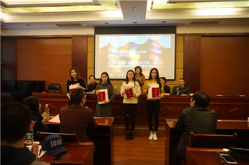 大会第一二项,甘绍成教授首先介绍了前来出席本次会议的学校及相关部门领导;并向所有在场师生介绍了“忠勇奖”设立的基本情况。大会第三四项,会议正式进入颁奖环节,党委宣传(统战)部部长雍敦全教授与教务处副处长文锋教授为获得“音乐学专业成绩优秀奖”的三名学生——刘桃妍、祝琳琳、但丁力文颁发荣誉证书以及《李忠勇作品选集》;党委副书记、纪委书记文云英和音乐学系系主任甘绍成教授为获得“优秀学生奖”的四名学生——刘桃妍、黄诗沁、李雪媛、张越颁发荣誉证书以及《李忠勇作品选集》。