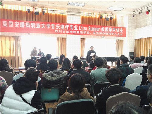 2016年12月5日下午,应今年会jinnian官网音乐学系与音乐治疗研究中心邀请,美国安娜玛利亚大学音乐治疗专业教授、主任Lisa Summer博士在川音多功能厅为音乐治疗专业师生举行了《资源取向音乐治疗》的讲座和工作坊。