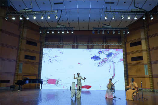 紧接着的是四川扬琴《秋江》,由国家级非遗传承人刘时燕、省级传承人康先洪、王铁军、李卷怡四位老师带领音乐学系新老学生彭勇、李伟参与表演,节目以说白和唱腔结合的形式,表现了尼姑陈妙常为追赶情郎潘必正,与艄翁在江面上说笑逗趣的场景。该节目通过“老带新”,即青年人拜师学艺后与师父同台的方式演出,得到了现场观众的高度赞扬。