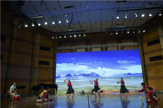 第二个节目是由音乐学系和民族声乐系学生们共同表演的嘉绒藏族民歌《吆牛歌》《打麦歌》,表演者歌声优美,舞蹈刚健有力,仿佛把观众带到了当地人民在田间地头耕作劳动的场景。