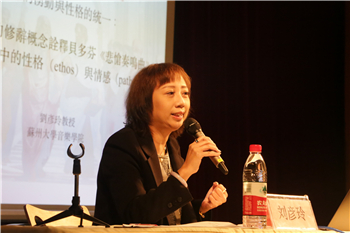 此场讲座由苏州大学音乐学院刘彦玲教授主讲,主题为《情感的涌动与统一:从昆体良的修辞概念诠释贝多芬<悲怆奏鸣曲>第一乐章中的人格与情感》,由上海音乐学院音乐学系梁晴教授主持。此场讲座从昆体良的“修辞学”角度出发,主要讨论了贝多芬在其《悲怆奏鸣曲》第一乐章中,是如何通过不同的“修辞格”与“动机节奏”来平衡情感的涌动,以致最终形成单一且独特的音乐性格的。刘教授对此场讲座做出了总结:“为了能有效地说服听众,情感必须贯穿整个‘感伤风格’的过程。”在讲座尾声,刘教授耐心地回答了在场师生提出的问题。