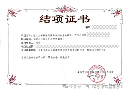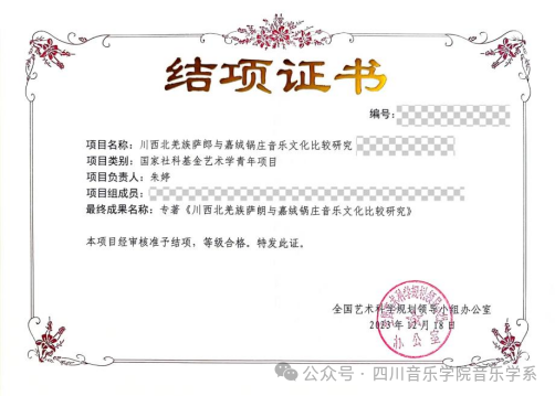 2023年12月,经全国艺术科学规划领导小组办公室审核认定,我系刘雯教授主持的国家社科基金艺术学西部项目《岷江上游藏羌传统多声部音乐的特点、传承与创新》(项目批准号:19ED201)、朱婷副教授主持的国家社科基金艺术学青年项目《川西北羌族萨朗与嘉绒锅庄音乐文化比较研究》(项目批准号:17CD191))通过鉴定,顺利结项。