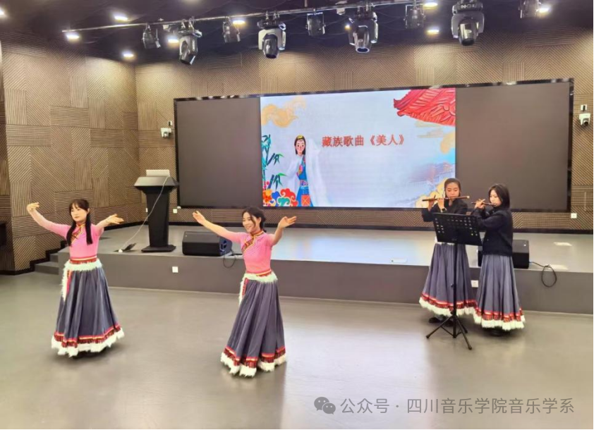 泽仁拉姆小组汇报了藏族歌曲《美人》。该歌曲改编自藏族民歌《次仁措姆》,歌曲描绘了雪山月夜中,背水姑娘轻唱弦子的动人场景,展现了云南高原女性的理想追求、坚毅性格和圣洁心灵。表演中,两位同学随着悠扬的笛声载歌载舞,把大家带到了雪域高原藏族人民翩翩起舞的场景中。