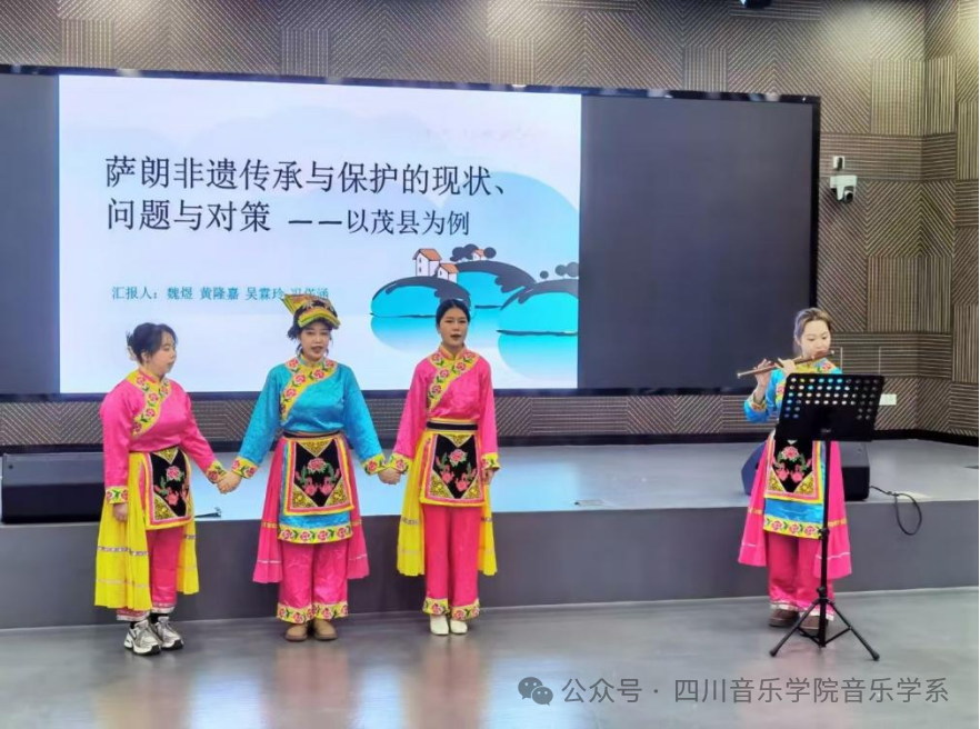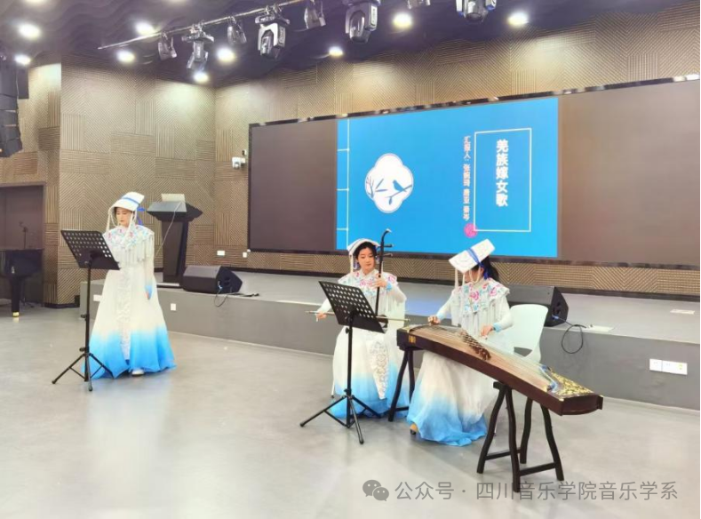 张婉琦小组汇报了羌族传统民歌《嫁女歌》。嫁女歌不仅承载羌族的历史与传统,还反映了婚俗礼仪,是了解羌族文化的重要窗口。嫁女歌表达了新娘对娘家的不舍以及对未来家庭生活的期待,展现了羌族女性对独立生活的向往和对美好生活的追求。同学们在二胡、古筝的伴奏中轻声歌唱,把现场的师生带入了羌族婚嫁仪式中新娘对父母、兄弟姐妹难舍难分的情境中。