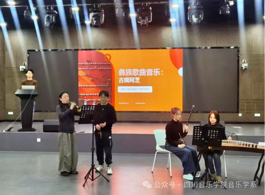 蒲超小组汇报了彝族歌曲《古嫫阿芝》。这首歌曲讲述了古嫫阿芝远嫁的故事,展现了彝族人民对故土与亲人的深厚情感,以及母爱的伟大与无私,传递了积极向上的生活态度。《古嫫阿芝》不仅丰富了彝族文化内涵,也为后人留下了珍贵的文化遗产。同学们以唢呐、古筝、二胡、笛子演奏乐曲,并伴以歌唱,生动诠释了这首作品的情感与意义。