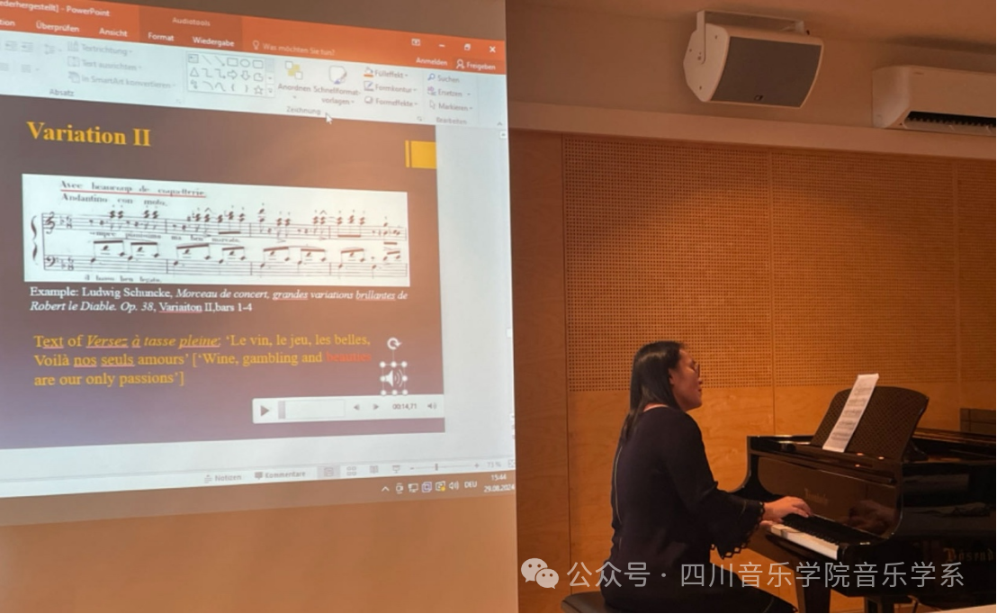 我系王娜娜老师应邀参加此次会议,并作主题发言:“阳刚抑或阴柔?——反思库尔贝画作和舒恩克钢琴改编中的罗伯特形象”(Masculine or feminine? Rethinking Robert in Courbet’s painting and Schuncke’s piano arrangement)。在此次发言中,王娜娜老师以古斯塔夫·库尔贝(Gustave Courbet)和路德维希·舒恩克(Ludwig Schuncke)对同一歌剧《恶魔罗勃》(Robert le diable)的不同回应形式为出发点,探讨了音乐与视觉艺术之间丰富的互动关系以及“编译”源文本中反讽义的多种可能性。无论是库尔贝的“视觉化音乐”或舒恩克的“音响化画面”的尝试都为原作中优柔寡断的罗伯特提供了颇具创意且富有挑战性的解读。这种艺术的融合也促使我们进一步思考,不同艺术形式如何在传递复杂叙事和反讽中发挥作用,并重构原作的接受史。
