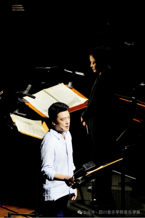 陈乐潇(2023级音乐学系硕士研究生):王耀庆的读剧与表演被合理地穿插到了音乐之中,时而相融又时而分离,从而使各首乐曲相串联起来,并赋予其极具张力的戏剧性和跌宕起伏的叙事性;加以总指挥、合唱团与交响乐团的完美配合,使歌唱、交响、剧情、旁白、表演等诸多因素巧妙地融为一体,极好地呈现了何为戏剧与交响的“混搭”,带给了现场观众一种颇为新奇的“视—听”体验。