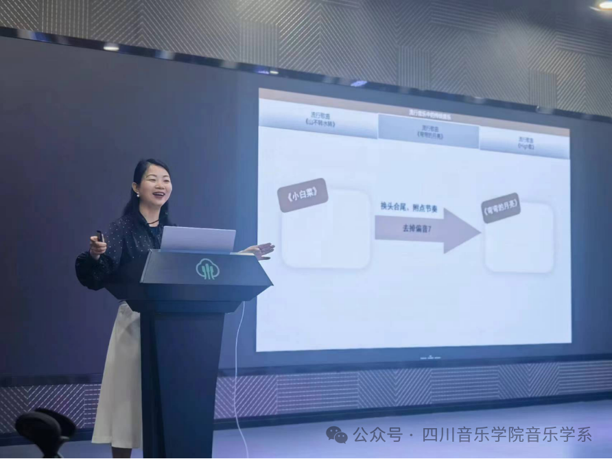 以流行音乐为例,袁环老师通过对三首脍炙人口的流行歌曲《山不转水转》、《弯弯的月亮》、《High歌》的演唱与音乐形态分析,将其与河北民歌《小白菜》进行对比,得出前两首流行歌曲均采用了河北民歌《小白菜》的音乐旋律,采用加花变奏、换头合尾、去掉偏音的手法对其进行加工创作而成;而《High歌》采用了二胡曲《赛马》的音乐元素。