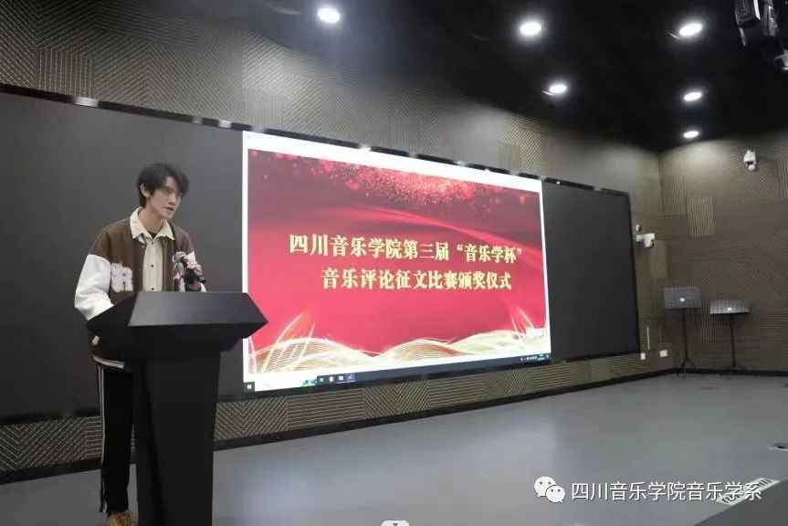 学生代表陈乐潇发表获奖感言。他感谢各位指导教师对同学们的悉心指导,有效地提高了大家的阅读能力、思考能力以及写作能力,通过这次比赛,大家的专业知识和综合水平得到了极大的提升,对音乐评论类文体的撰写有了更为深入的认识。