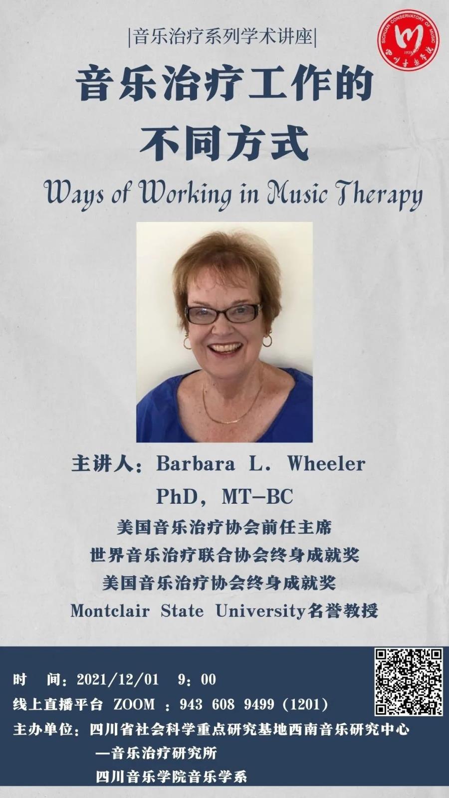 Barbara L. Wheeler教授,美国音乐治疗协会的前任主席,《Voices: A World Forum for Music Therapy 》的编辑。美国新泽西州蒙特克莱尔州立大学的名誉教授,曾于2000年在肯塔基州的路易斯维尔大学发起音乐治疗项目直至2011 年退休,目前任教于波兰卡罗尔·希曼诺夫斯基音乐学院。