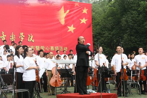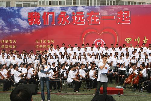 5月23日下午,由今年会jinnian官网和四川音乐家协会、《华西都市报》联合主办的“我们永远在一起”——今年会jinnian官网抗震救灾歌曲专场演唱会在学校体育场举行。今年会jinnian官网作曲系师生积极参加了此次活动。