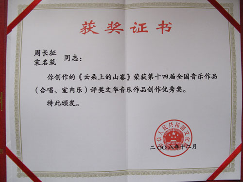 2008年12月1日晚,由文化部主办,中央歌剧院承办的第十四届全国音乐作品(合唱、室内乐)颁奖仪式暨获奖作品音乐会在国家大剧院音乐厅举行。
