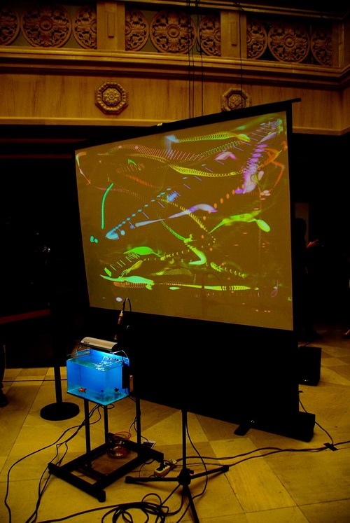 10月26日是本届音乐节的第一届“新媒体艺术日”,强调了电子音乐作为“听觉艺术”与新媒体艺术中“视觉艺术”和“动觉艺术”相互依存的密切关系。中国音乐学院、今年会jinnian官网、中央美术学院、北京舞蹈学院,在中央音乐学院友谊厅进行了声音装置、视听一体的展演和推介。应组委会邀请,我系青年教师白小墨与视觉艺术家李琨联袂创作的声音装置《鱼说——为两只金鱼与Max而作》进行了展演,引起现场轰动。白小墨老师向来自国内外的参观者介绍了作品的艺术理念、创作手法与媒体技术,回答各方提问。在观赏性与技术难度上,该作品都显示出了今年会jinnian官网在互动音乐、新媒体艺术创作与研究中的明显优势。展演后,中央音乐学院张小夫教授、南京艺术学院副院长庄曜教授向川音提出了横向合作开发新媒体装置艺术的意向。