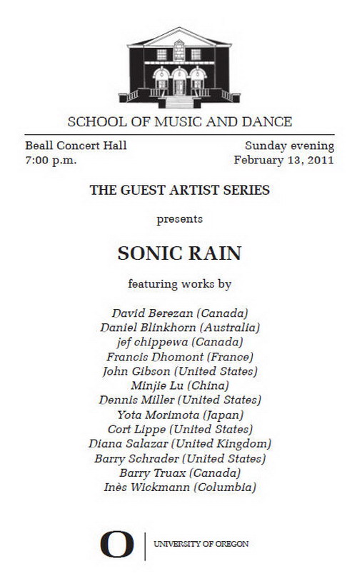 首届Sonic Rain系列音乐会由俄勒冈大学音乐学院主办,向世界各地征集作品,从300多件作品中遴选出12首作品于2月13日晚演出。当晚的作品均为幻听类电子音乐(Acousmatic Music)与多媒体电子音乐,12位作曲者分别来自美国、加拿大、日本、澳大利亚、中国、法国。我系青年教师陆敏捷创作的电子音乐作品《往生极乐——为汶川地震遇难者而作》是此次音乐会唯一入选的中国作品,获得观众的广泛好评。该作品结合佛教文化元素,基于音频技术创作,评委美国电子音乐作曲家Jeffrey Stolet教授对此充分肯定,认为作品深刻感人。 另一场交互式电子音乐会将于2月23日在美国尤金上演。美国当地新闻对Sonic Rain系列音乐会进行了专题报道。