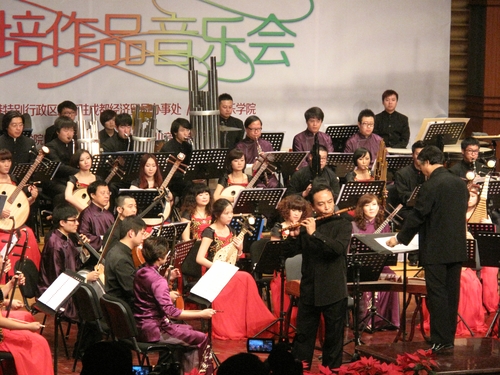 音乐会下半场演出由香港中乐团艺术总监、特约著名指挥家阎惠昌先生亲自带领乐团演绎。首先演绎的是林乐培先生在学生时代研究巴哈《音乐奉献》中的黄金对位法后写出的一页乐谱两头通的小提琴二重奏《回文曲》。两位小提琴演奏家,一位顺着演奏,一位倒着演奏,使音乐更加的抑扬起伏,十分奇妙。第二个作品《阿诗玛叙事诗》是由我院易柯院长、易加义教授、张保庆教授创作,曾获得全国第三届音乐作品二等奖。乐曲体裁取自云南撒尼族叙事长诗《阿诗玛》,音乐素材主要取自撒尼族民歌《叙事诗》、《留月调》。乐曲由引子、天空闪出一朵花、拒媒、思念、回声等段落构成,音乐具有较强的叙事功能。音乐会的最后一个作品《秋诀》,是林乐培先生1978年在传统的基础上,根据关汉卿《窦娥冤》进行创作的,是香港中乐团尝试走向现代交响化的一个里程碑。这首作品的特征是“创新而不忘本”,虽然作曲家用了很多新的手法与概念,却仍能把中国传统的表演艺术作精细的描述。音乐运用许多特别的乐器以表达不同的情景,如用雷琴表现窦娥的独白;箫表现人物内心的凄凉;“众乐乱弹”则表现围观群众的喧嚣声等等,形象地突出了作品戏剧化的特点,被音乐品论家岱弘誉为是香港中乐团的“扛鼎之作”。