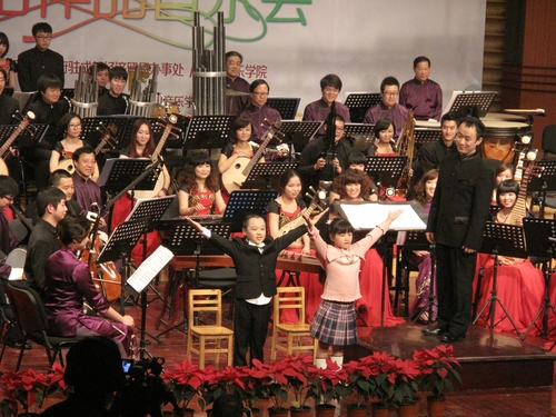 音乐会的上半场由青年指挥家肖超指挥。演出的作品是我院邹向平教授的《班车号子与山歌》,乐曲以四川民歌为素材,具有四川特有的音乐风格。音乐响起,使人联想到上世纪五、六十年代的成都:人力板车的号子、叫卖的吆喝声,将过去的市井场景托显出来。以一曲“槐花几时开”的旋律穿插于乐曲各部,把力量、热情的气氛用优美、闲逸的情趣分攘开来,最后又把二者合在一起,形成盎然的生机。林乐培先生将古曲《春江花月夜》以变奏形式发展,保留并发挥了古琴与琵琶的演奏效果,用钢琴与乐队进行演绎。第三个作品是林乐培作于1979年的《昆虫世界》,这是一首尝试扩充中国音乐调性、和声与音色组合的试验品。全曲共分五段,每段乐曲都以音响去素描昆虫的形象,再以旋律写出其中的意境,用音乐来描绘了一个奇妙的昆虫的世界。此次在我院的演出还特别邀请了两位成都本地的小朋友作为乐段作旁白,融入了浓浓的四川风味。