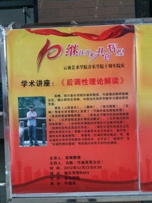 2012年岁末,在云南艺术学院音乐学院举办成立十周年院庆之际,我系高畅教授应邀于2012年12月23日上午在云南艺术学院音乐学院B403学术报告厅举办了“后调性理论解读”的专题学术讲座。该讲座是云南艺术学院音乐学院作曲系在院庆活动中承办的三项重要活动之一,因而得到了音乐学院全体师生的高度关注,作曲系全体师生参加了讲座。
