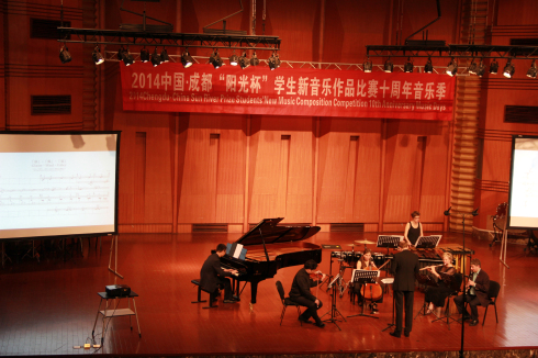 音乐会开始之前,第十届(2014)“阳光杯”学生新音乐作品比赛评委会主席何训田教授代表本届评委会宣布了2014中国•成都“阳光杯”学生新音乐作品比赛的获奖学生名单。本届赛事共收到来自中国、中国香港、美国、英国、德国、俄罗斯、韩国、希腊、巴西、斯洛文尼亚、克罗地亚、以色列等不同国家和地区的71部参赛作品。通过评委会三轮认真评选,最终6部作品获等次将并颁发证书与奖金,6部作品获作品奖并颁发证书。