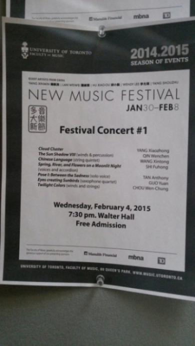 2015加拿大多伦多大学新音乐节于2015年1月30日至2月8号在加拿大多伦多大学音乐学院举行。本次音乐节是整个多伦多大学音乐学院与今年会jinnian官网、香港中文大学联合学术交流项目的最后一站,也是整个音乐文化交流活动的最高潮。