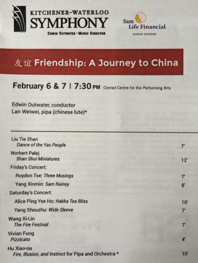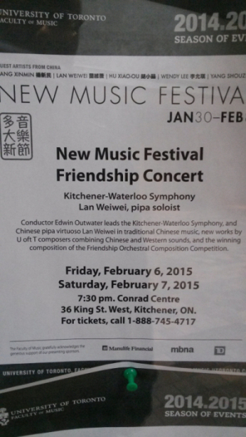 2月6日-7日,音乐节转移至多伦多市附近的基奇纳市,为随后交响音乐会做彩排准备。期间作曲家们和乐团指挥紧密合作,整个排练时间紧凑而卓有成效。此次交响音乐会中新作品来源于音乐节组委会向与会的三方机构征集遴选出的4首中国风格作品。 音乐会演奏了加拿大作曲家(本次音乐节音乐总监)Norbert Palej的作品《山水画》。这首根据五段中国民歌改变创作而成管弦乐作品出于作曲家独到的配器手法而体现异样的风格。 我院作曲系杨新民教授的作品《山岚》,该作品以空灵飘渺的管弦乐队笔法,在刻画山岚的精神气韵的同时,创造出具有形、神、境、意的音响艺术空间。 我院作曲系研究生杨首株的作品《广袖》,作品取材于中国传统汉朝服饰,以泛调性的音乐布局表达一种对中国传统礼仪文化的现代思考。 加拿大本土华人作曲家Roydon Tse的《沉思》。 华人女作曲家何冰颐女士的《客家茶的祝福》。 我院作曲系旅美作曲家胡晓欧先生的琵琶协奏曲《火焰、幻觉和本能》,由中央音乐学院著名青年琵琶演奏家兰维薇担任琵琶独奏。作品取材于陕北民歌兰花花,具有精巧细腻的管弦乐手法而富于音响冲击力。 音乐会上同时还展演了中国本土作曲家刘铁山先生的管弦乐作品《瑶族舞曲》和作曲家王西麟先生的《火把节》。 作曲系 2015.3.9.